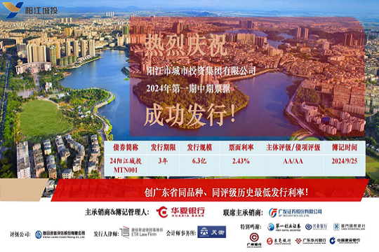 2024年9月26日,市城投集團在中國銀行間交易商協(xié)會成功發(fā)行“陽江市城市投資集團有限公司2024年第一期中期票據”。本期債券發(fā)行規(guī)模為6.3億元,期限為3年,票面利率2.43%,全場倍數(shù)超過2.52倍。本期債券創(chuàng)下了廣東省同...
