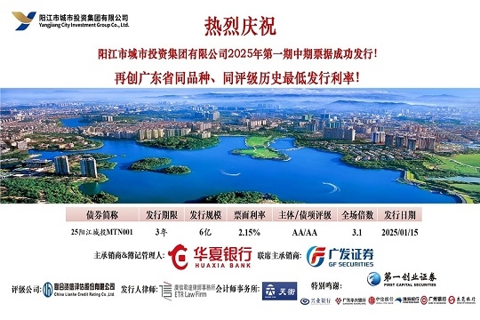 2025年1月15日,市城投集團在中國銀行間交易商協(xié)會成功發(fā)行“陽江市城市投資集團有限公司2025年第一期中期票據”。本期債券發(fā)行規(guī)模為6億元,期限為3年,票面利率2.15%,全場倍數(shù)超過3.1倍,合計申購機構數(shù)23家。本期債...